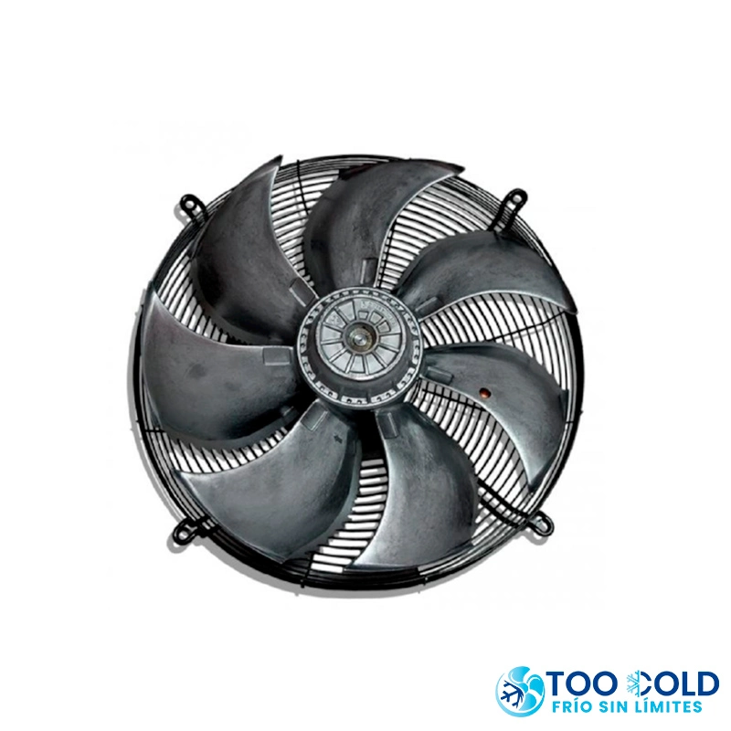 Ventilador axial industrial de alto rendimiento, diseñado para aplicaciones en sistemas de refrigeración como evaporadores y condensadores. Cuenta con rejilla de protección y motor trifásico, ofreciendo un flujo de aire eficiente, bajo nivel de ruido y excelente durabilidad en operación continua.